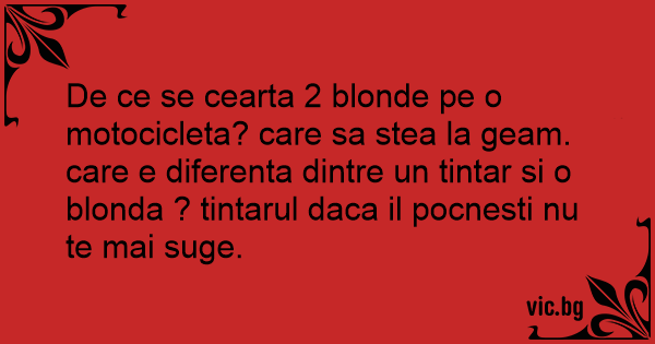 De ce se cearta 2 blonde pe o motocicleta? care sa stea la geam. care e diferenta dintre un tintar si o blonda ? tintarul daca il pocnesti nu te mai suge.
