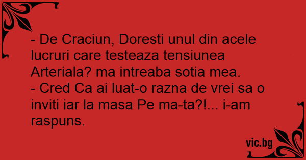 - De Craciun, Doresti unul din acele lucruri care testeaza tensiunea Arteriala? ma intreaba sotia mea.