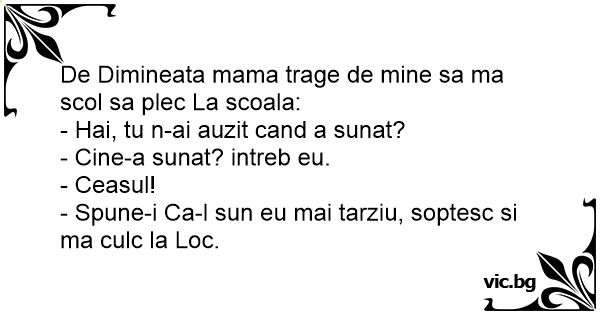 De Dimineata mama trage de mine sa ma scol sa plec La scoala: - Hai, tu n-ai auzit cand a sunat? - Cine-a sunat? intreb eu. - Ceasul! - Spune-i Ca-l sun eu mai tarziu, soptesc si ma culc la Loc.