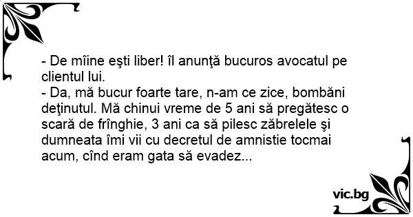 - Da, mă bucur foarte tare, n-am ce zice, bombăni deţinutul. Mă chinui vreme de 5 ani să pregătesc o scară de frînghie, 3 ani ca să pilesc zăbrelele şi dumneata îmi vii cu decretul de amnistie tocmai acum, cînd eram gata să evadez...