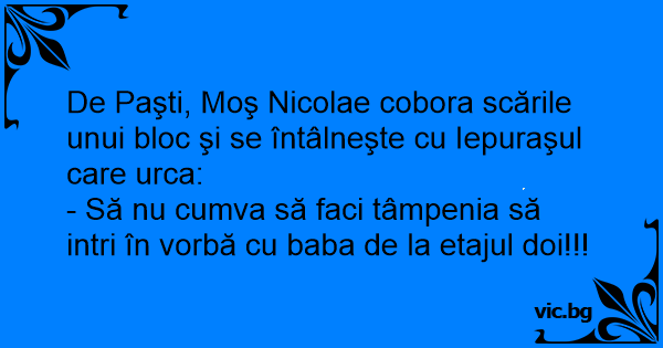 De Paşti, Moş Nicolae cobora scările unui bloc şi se întâlneşte cu Iepuraşul care urca: