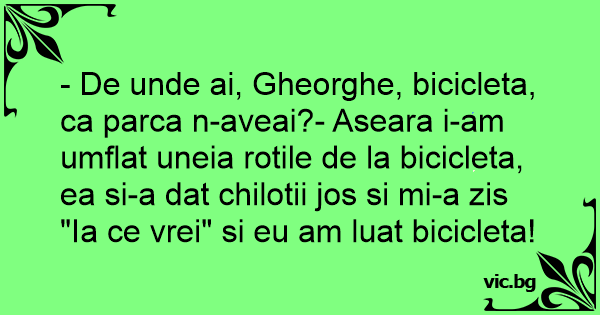 - De unde ai, Gheorghe, bicicleta, ca parca n-aveai?- Aseara i-am umflat uneia rotile de la bicicleta, ea si-a dat chilotii jos si mi-a zis "Ia ce vrei" si eu am luat bicicleta!