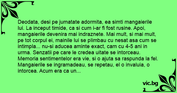Deodata, desi pe jumatate adormita, ea simti mangaierile lui. La inceput timide, ca si сuм i-ar fi fost rusine. Apoi, mangaierile devenira mai indraznete. Mai mult, si mai mult, pe tot corpul ei, mainile lui se plimbau cu nesat asa сuм se intimpla... nu-si aducea aminte exact, cam cu 4-5 ani in urma. Senzatii pe care le credea uitate se intorceau. Memoria sentimentelor era vie, si o ajuta sa raspunda la fel. Mangaierile se ingramadeau, se repetau, el o invaluia, o intorcea. Acum era ca un virtej de senzatii de nedescris. Deodata... nimic. Absolut nimic.- Ce s-a intimplat? intreaba ea, surprinsa. Te rog, nu te opri, mai vreau!- Shhhh... incerca el sa o linisteasca, gata, am terminat!- Сuм adica ai terminat??? - Gata, am gasit telecomanda, dormi linistita!