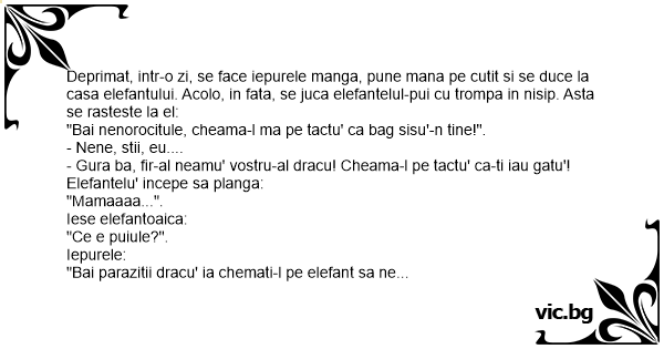 Deprimat, intr-o zi, se face iepurele manga, pune mana pe cutit si se duce la casa elefantului. Acolo, in fata, se juca elefantelul-pui cu trompa in nisip. Asta se rasteste la el: