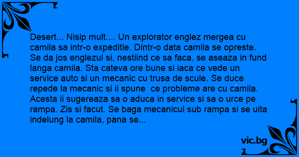 Bula in desert calare Pe o camila. La un moment dat i se strica Camila. Neavand ce face, duce camila la servisul de camile . Ajuns la service mecanicul de camile urca camila pe rampa Ia doua...