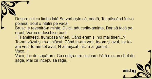Despre cei cu limba lată Se vorbeşte că, odată, Tot păscând într-o poiană, Boul o-ntâlni pe vacă.