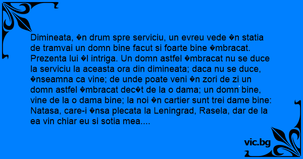 Dimineata, �n drum spre serviciu, un evreu vede �n statia de tramvai un domn bine facut si foarte bine �mbracat.