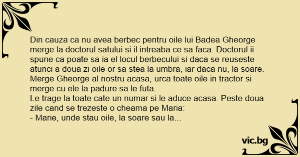 Din cauza ca nu avea berbec pentru oile lui Badea Gheorge merge la doctorul satului si il intreaba ce sa faca. Doctorul ii spune ca poate sa ia el locul berbecului si daca se reuseste atunci a doua zi oile or sa stea la umbra, iar daca nu, la soare.
