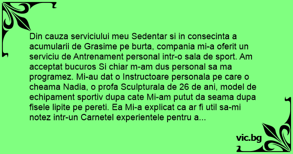 Din cauza serviciului meu Sedentar si in consecinta a acumularii de Grasime pe burta, compania mi-a oferit un serviciu de Antrenament personal intr-o sala de sport. Am acceptat bucuros Si chiar m-am dus personal sa ma programez. Mi-au dat o Instructoare personala pe care o cheama Nadia, o profa Sculpturala de 26 de ani, model de echipament sportiv dupa cate Mi-am putut da seama dupa fisele lipite pe pereti. Ea Mi-a explicat ca ar fi util sa-mi notez intr-un Carnetel experientele pentru a putea observa eu insumi Progresul. Zis si facut si acum as vrea sa Impartasesc cu voi acest mic jurnal.