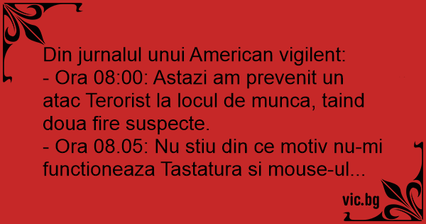 - Ora 08:00: Astazi am prevenit un atac Terorist la locul de munca, taind doua fire suspecte.