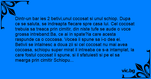 Dintr-un bar ies 2 betivi,unul cocosat si unul schiop. Dupa ce se saluta, se indreapta fiecare spre casa lui. Cel cocosat trebuia sa treaca prin cimitir, din niste tufe se aude o voce groasa intreband:Ba, ce ai in spate?la care acesta raspunde ca o cocoasa. Vocea ii spune sa i-o dea ei.