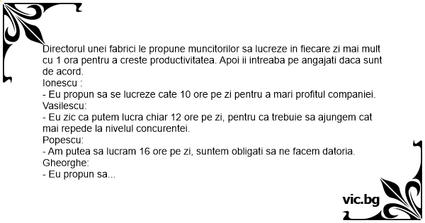 Directorul unei fabrici le propune muncitorilor sa lucreze in fiecare zi mai mult cu 1 ora pentru a creste productivitatea. Apoi ii intreaba pe angajati daca sunt de acord.