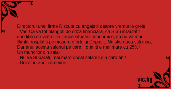 - Vad Ca va tot plangeti de criza financiara, ca S-au inrautatit conditiile de viata Din cauza situatiei economice, ca nu va mai Simtiti rasplatiti pe masura efortului Depus... Nu stiu daca stiti insa, Dar anul acesta salariul pe care il primiti e mai mare cu 25%!