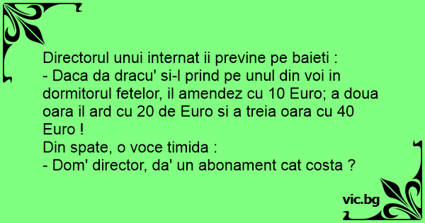 - Daca da dracu' si-l prind pe unul din voi in dormitorul fetelor, il amendez cu 10 Euro; a doua oara il ard cu 20 de Euro si a treia oara cu 40 Euro !