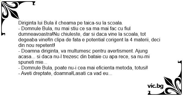 - Domnule Bula, nu mai stiu ce sa ma mai fac cu fiul dumneavoastra!Nu chiuleste, dar si daca vine la scoala, tot degeaba vine!In clipa de fata e potential corigent la 4 materii, deci din nou repetent!