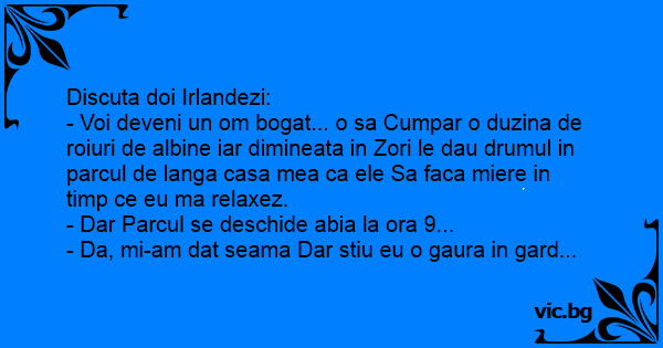 - Voi deveni un om bogat... o sa Cumpar o duzina de roiuri de albine iar dimineata in Zori le dau drumul in parcul de langa casa mea ca ele Sa faca miere in timp ce eu ma relaxez.