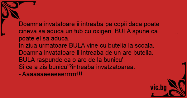 Doamna invatatoare ii intreaba pe copii daca poate cineva sa aduca un tub cu oxigen. BULA spune ca poate el sa aduca.