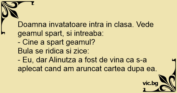 Doamna invatatoare intra in clasa. Vede geamul spart, si intreaba: