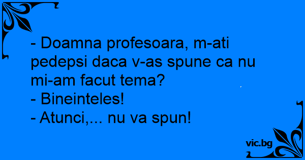 - Doamna profesoara, m-ati pedepsi daca v-as spune ca nu mi-am facut tema?