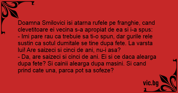 Doamna Smilovici isi atarna rufele pe franghie, cand clevetitoare ei vecina s-a apropiat de ea si i-a spus: