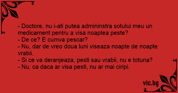 - Doctore, nu i-ati putea admininstra sotului meu un medicament pentru a visa noaptea peste?