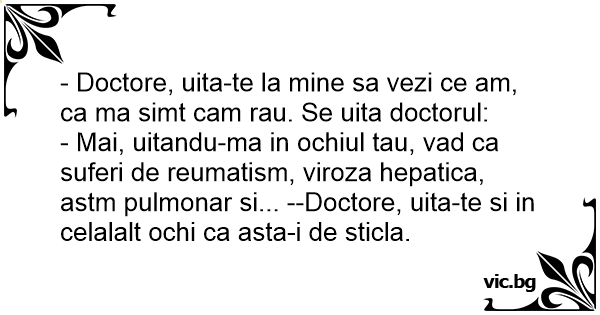- Mai, uitandu-ma in ochiul tau, vad ca suferi de reumatism, viroza hepatica, astm pulmonar si... --Doctore, uita-te si in celalalt ochi ca asta-i de sticla.