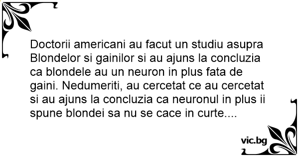 Doctorii americani au facut un studiu asupra Blondelor si gainilor si au ajuns la concluzia ca blondele au un neuron in plus fata de gaini. Nedumeriti, au cercetat ce au cercetat si au ajuns la concluzia ca neuronul in plus ii spune blondei sa nu se cace in curte....