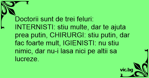INTERNISTI: stiu multe, dar te ajuta prea putin, CHIRURGI: stiu putin, dar fac foarte mult, IGIENISTI: nu stiu nimic, dar nu-i lasa nici pe altii sa lucreze.