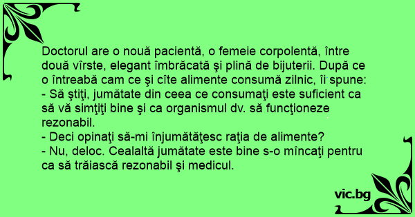 Doctorul are o nouă pacientă, o femeie corpolentă, între două vîrste, elegant îmbrăcată şi plină de bijuterii. După ce o întreabă cam ce şi cîte alimente consumă zilnic, îi spune: