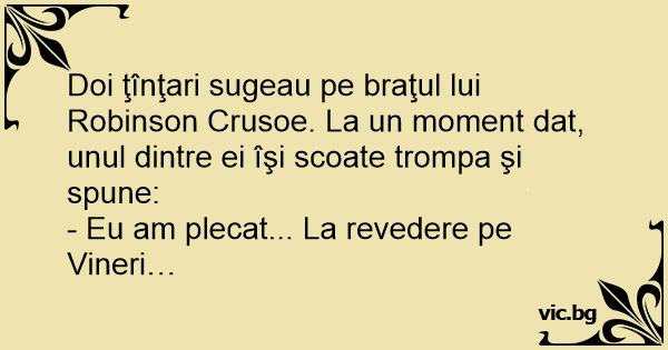 Doi ţînţari sugeau pe braţul lui Robinson Crusoe. La un moment dat, unul dintre ei îşi scoate trompa şi spune:
