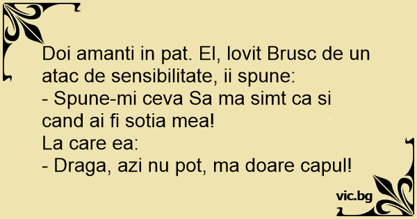 Doi amanti in pat. El, lovit Brusc de un atac de sensibilitate, ii spune:<br />- Spune-mi ceva Sa ma simt ca si cand ai fi sotia mea!<br />La care ea:<br />- Draga, azi nu рот, ma doare capul!