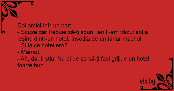 - Scuze dar trebuie să-ţi spun: ieri ţi-am văzut soţia ieşind dintr-un hotel, însoţită de un tânăr macho!