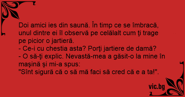 Doi amici ies din saună. În timp ce se îmbracă, unul dintre ei îl observă pe celălalt сuм ţi trage pe picior o jartieră.