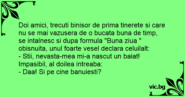 Doi amici, trecuti binisor de prima tinerete si care nu se mai vazusera de o bucata buna de timp, se intalnesc si dupa formula "Buna ziua " obisnuita, unul foarte vesel declara celuilalt: