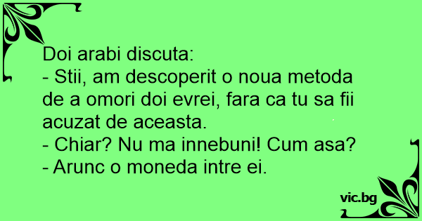 Двама араби обсъждат: - Открих нов начин да убия двама евреи, без да ме обвинят. - Наистина ли? Как? - Хвърлям монета между тях.