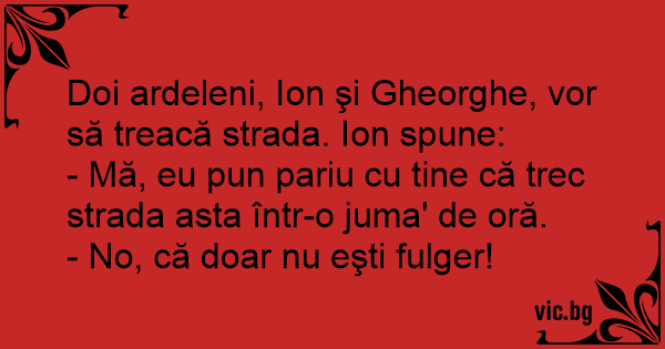 Doi ardeleni, Ion şi Gheorghe, vor să treacă strada. Ion spune: