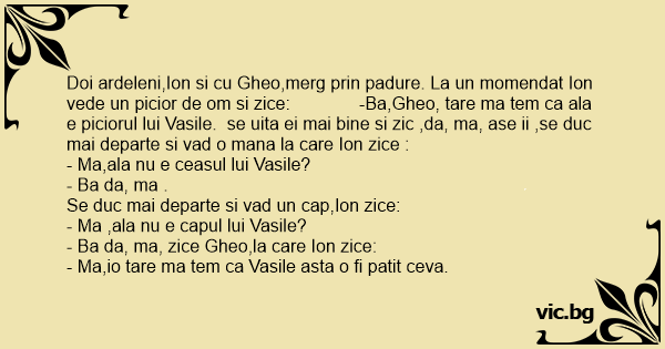 Doi ardeleni,Ion si cu Gheo,merg prin padure. La un momendat Ion vede un picior de om si zice: -Ba,Gheo, tare ma tem ca ala e piciorul lui Vasile. se uita ei mai bine si zic ,da, ma, ase ii ,se duc mai departe si vad o mana la care Ion zice :