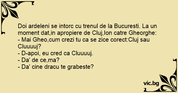 Doi ardeleni se intorc cu trenul de la Bucuresti. La un moment dat,in apropiere de Cluj,Ion catre Gheorghe: