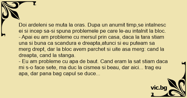 Doi ardeleni se muta la oras. Dupa un anumit timp,se intalnesc ei si incep sa-si spuna problemele pe care le-au intalnit la bloc.