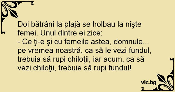 - Ce ţi-e şi cu femeile astea, domnule... pe vremea noastră, ca să le vezi fundul, trebuia să rupi chiloţii, iar acum, ca să vezi chiloţii, trebuie să rupi fundul!