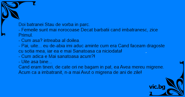 Cand eram tineri, de cate ori ne bagam in pat, ea Avea mereu migrene. Acum ca a imbatranit, n-a mai Avut o migrena de ani de zile!
