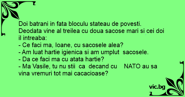 - Ma Vasile, tu nu stii ca decand cu NATO au sa vina vremuri tot mai cacacioase?