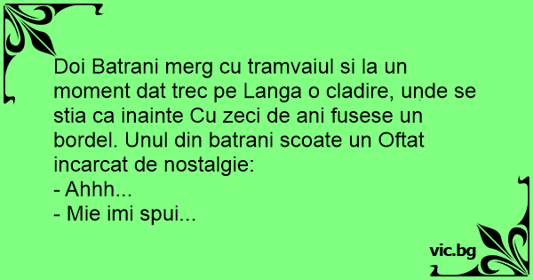 Doi Batrani merg cu tramvaiul si la un moment dat trec pe Langa o cladire, unde se stia ca inainte Cu zeci de ani fusese un bordel. Unul din batrani scoate un Oftat incarcat de nostalgie: