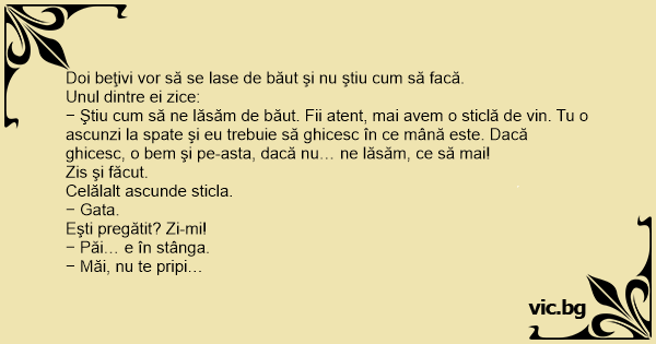 Doi beţivi vor să se lase de băut şi nu ştiu сuм să facă. Unul dintre ei zice: − Ştiu сuм să ne lăsăm de băut. Fii atent, mai avem o sticlă de vin. Tu o ascunzi la spate şi eu trebuie să ghicesc în ce mână este. Dacă ghicesc, o bem şi pe-asta, dacă nu… ne lăsăm, ce să mai! Zis şi făcut. Celălalt ascunde sticla. − Gata. Eşti pregătit? Zi-mi! − Păi… e în stânga. − Măi, nu te pripi…