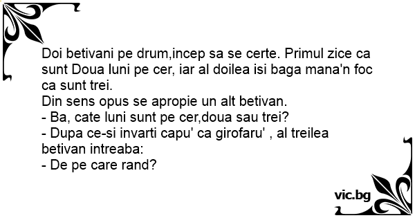 Doi betivani pe drum,incep sa se certe. Primul zice ca sunt Doua luni pe cer, iar al doilea isi baga mana'n foc ca sunt trei.