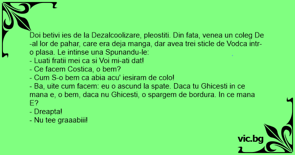 Doi betivi ies de la Dezalcoolizare, pleostiti. Din fata, venea un coleg De-al lor de pahar, care era deja manga, dar avea trei sticle de Vodca intr-o plasa. Le intinse una Spunandu-le: