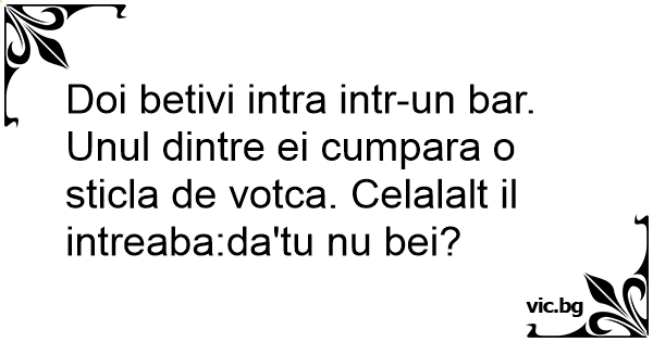 Doi betivi intra intr-un bar. Unul dintre ei cumpara o sticla de votca. Celalalt il intreaba:da'tu nu bei?