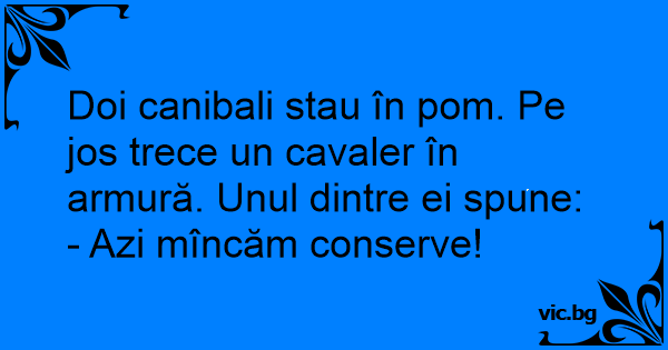 Doi canibali stau în pom. Pe jos trece un cavaler în armură. Unul dintre ei spune: