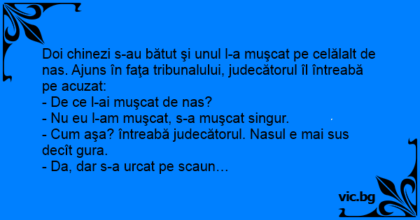 Doi chinezi s-au bătut şi unul l-a muşcat pe celălalt de nas. Ajuns în faţa tribunalului, judecătorul îl întreabă pe acuzat:
