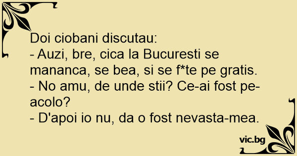 - Auzi, bre, cica la Bucuresti se mananca, se bea, si se f*te pe gratis.